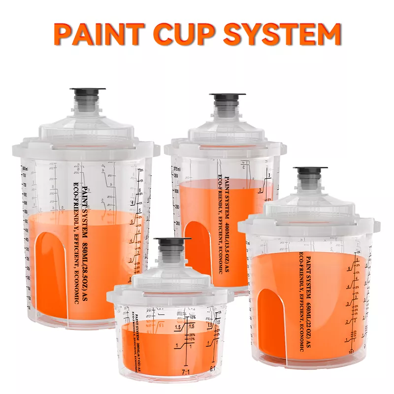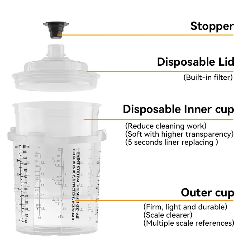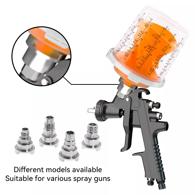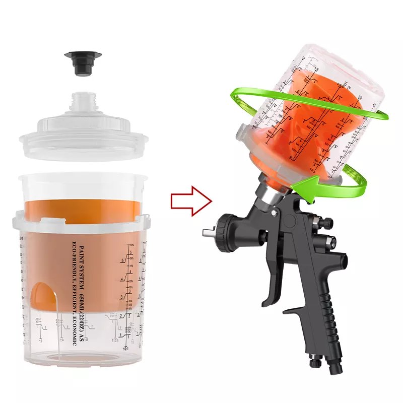 Läbipaistev tasside kujundus võimaldab järelejäänud värvi jälgida. Ühekordselt kasutatav pihustuskupp tagab, et pihustuspüstol võib pihustada 360 kraadi ilma värvi lekitamata, mis võib värvi tilgutamisest põhjustatud puidutera pinna saastuda. See sobib PU/NC värvi pihustamiseks puidust ustel, kappidele ja täispuidust mööblile.