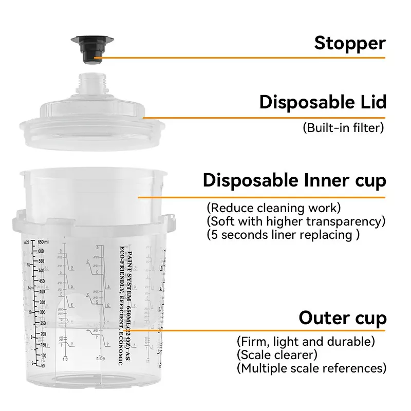 650ml ühekordselt kasutataval pihustuspüstolitel on integreeritud klõpsu kujundus, mis on tassi servas. Kaas lukustub välisse tassi, keerates seda 1/4 pööret päripäeva, vähendades veelgi sisemise tassi vahetamiseks kuluvat aega. See muudab need eriti sobivaks mitmevärviliseks pihustamiseks, parandades värvi värvi muutmise tõhusust. Kaebuseta disain välistab ka võimaluse, et tass muutub kadunud kaelarihma tõttu kasutamiskõlbmatuks.