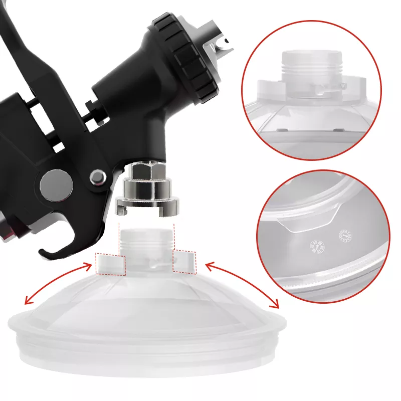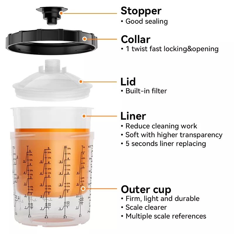 850ML Speedy Paint System 2.0 koosneb peamiselt 5 osast: pistik, kaas, krae, vooder ja välimine tass. Nende hulgas, välja arvatud see, et sisemine on valmistatud PE-st, on ülejäänud peamiselt valmistatud PP-st. Vooder on väga pehme ning seda on lihtne välja võtta ja vahetada; ülejäänud osad on tugevad ja väga vastupidavad. Ühekordselt kasutatava värvitopsisüsteemi tekkimine võib suurepäraselt asendada traditsioonilise gravitatsioonilise toitesüsteemi, mis mitte ainult ei vähenda pesemiskulusid, vaid suurendab ka värvi kasutusmäära, säästes seeläbi kulusid. Veelgi enam, kuna tassisüsteemi pole vaja puhastada, väldivad maalrid otsest kokkupuudet mürgise värviga, et oleks tagatud nende tervis. Sellise keskkonnasõbraliku ja tõhusa toote väljatöötamine ja tootmine on täpselt see, mida Aspaint teeb.
