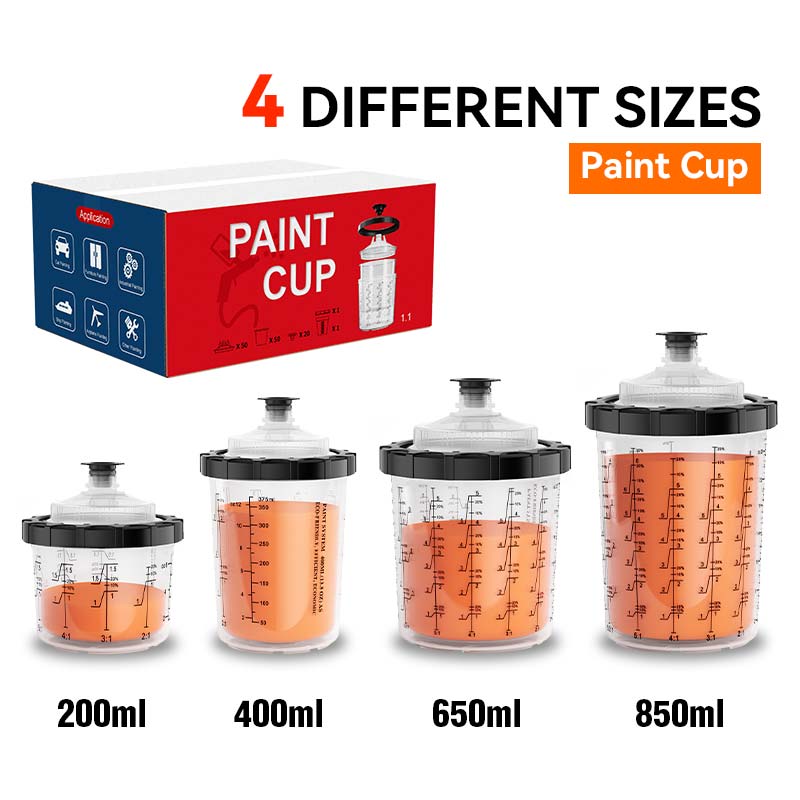 Turu-uuringute põhjal on värvikopp saadaval neljas mahutavuses: 200 ml, 400ml, 650ml ja 850 ml, toitlustades erinevaid kasutusstsenaariume, kas suure piirkonna pritsimiseks või üksikasjalike puudutuste jaoks. Lisaks on tassi sisemine konstruktsioon optimeeritud, et tagada sujuv värv, vähendades ummistumist ja jäätmeid.