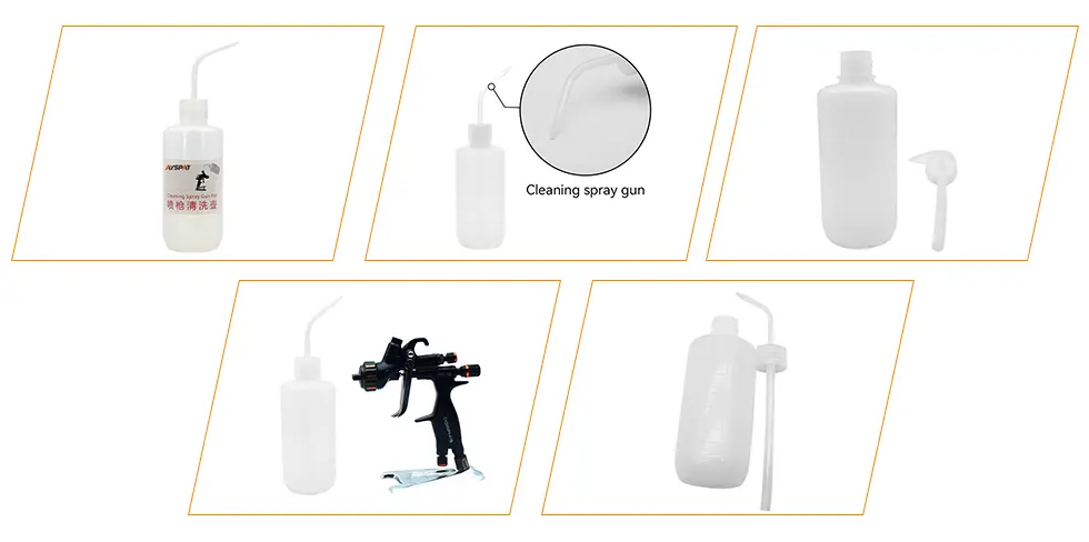 Aypat pihustuspüstolite pesemispott on tõhus pihustuspüstoli puhastusvahend, millel on suurepärane puhastusmõju. See võib pihustuspüstolisse jäänud värvi kiiresti loputada, mis võib pihustuspüstoli sisemuses paremini kaitsta. Pihustuspüstoli pesemispotti on lihtne kasutada ning pudeli korpuse pigistamise teel saab vedeliku voolu intensiivsust ja suunda täpselt juhtida. Pärast maalimistoimingut kasutage relvapesupotti lahusti laadimiseks, et loputada pihustuspüstoli sees olevate keerukate torude plekke, mis suudab säilitada pihustuspüstoli ja pikendada märkimisväärselt selle kasutusaega. Püssipesupudel on valmistatud pehmest ja kergest PP -materjalist, mis on vastupidav lahustite nagu atsetooni ja tolueeniga korrosioonile. See on ideaalne lahendus teie pihustuspüstoli hooldamiseks.